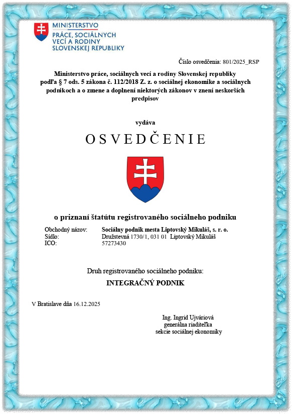 V decembri 2025 sa podarilo pracovnému tímu pána primátora získať pre sociálny podnik Osvedčenie o priznaní štatútu Registrovaného Sociálneho Podniku z ministerstva práce, sociálnych vecí a rodiny Slovenskej republiky.